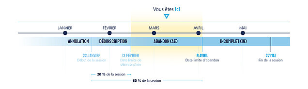 Important : Les personnes inscrites à des cours ayant une organisation différente de la session régulière (cours intensifs, certains stages, etc.) devront respecter d’autres dates limites. La limite de désinscription correspond à 20% de la prestation du cours, tandis que celle de l’abandon correspond à l’atteinte de 60%. Ces dates sont indiquées au plan de cours.